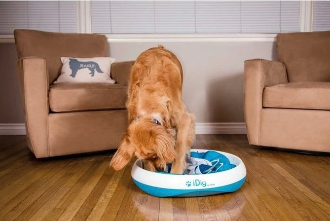First, bury the treasure - load the pockets of the idig flaps with your pup's favorite toys and treats and encourage them to “get it!” or “find it!”. It will tire them out - the mental energy it takes to figure out how TO uncover the “loot” will tire them out just as much as physically digging.