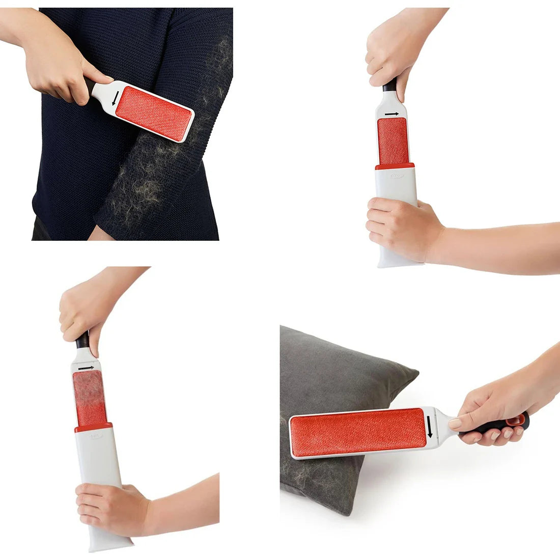 Swipe your FurLifter across surfaces following the clear, directional arrow on the handle. The micro bristles effectively lift off stray fur, hair, and lint.